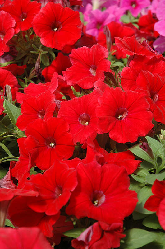 Potunia Plus Red Petunia is smothered in stunning red trumpet-shaped flowers at the ends of the stems from mid spring to late summer. Its pointy leaves remain green in color throughout the season.