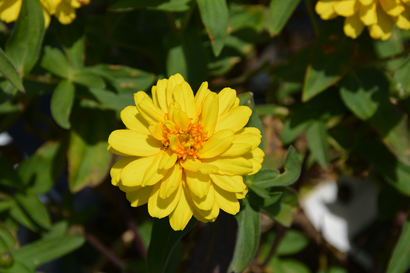 Profusion Double Yellow Zinnia will grow to be about 14 inches tall at maturity, with a spread of 18 inches. When grown in masses or used as a bedding plant, individual plants should be spaced approximately 14 inches apart. Its foliage tends to remain dense right to the ground, not requiring facer plants in front. This fast-growing annual will normally live for one full growing season, needing replacement the following year.