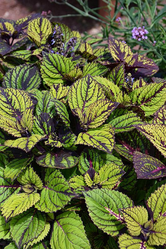 Fishnet Stockings Coleus' attractive serrated pointy leaves remain chartreuse in color with distinctive deep purple veins throughout the year on a plant with an upright spreading habit of growth.