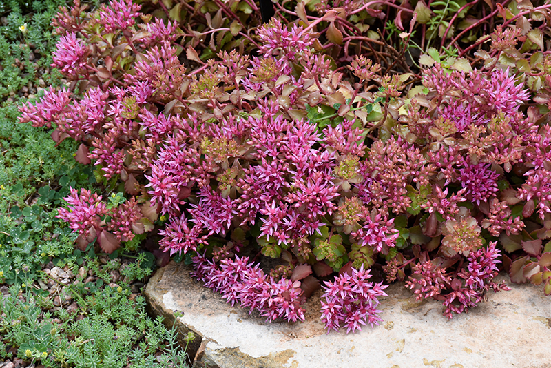 Ruby Mantle Stonecrop will grow to be only 4 inches tall at maturity extending to 6 inches tall with the flowers, with a spread of 20 inches. When grown in masses or used as a bedding plant, individual plants should be spaced approximately 16 inches apart. Its foliage tends to remain low and dense right to the ground. It grows at a fast rate, and under ideal conditions can be expected to live for approximately 10 years. As an evegreen perennial, this plant will typically keep its form and foliage year-round.