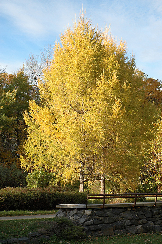 A tall, loose coniferous tree with fine, deciduous needles, starting bright green in spring and turning brilliant gold in fall; prefers moist locations and light soils; can look a little odd in winter without needles, but simply glows the other 3 seasons