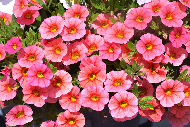 Superbells® Coralina Calibrachoa is clothed in stunning coral-pink trumpet-shaped flowers with yellow throats and red veins at the ends of the stems from late spring to early fall. Its small pointy leaves remain green in color throughout the season.