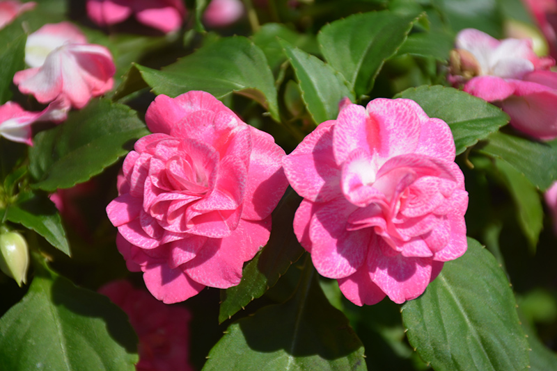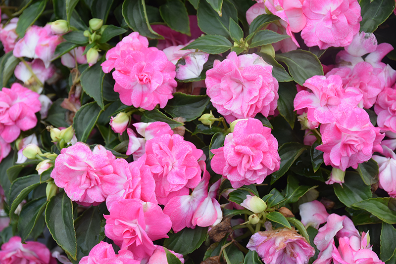 Rockapulco® Rose Impatiens is bathed in stunning double rose round flowers with white overtones and a white reverse at the ends of the stems from mid spring to mid fall. Its small pointy leaves remain dark green in color throughout the season.