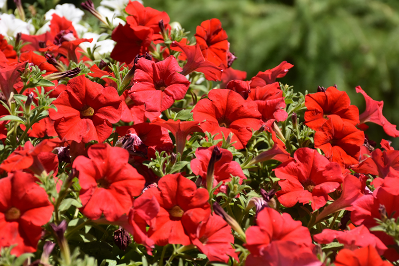 Supertunia® Really Red Petunia is clothed in stunning red trumpet-shaped flowers with gold throats at the ends of the stems from mid spring to mid fall. Its pointy leaves remain green in color throughout the season.