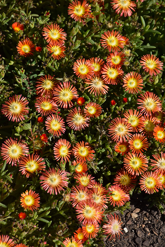 A low growing carpet-like, succulent, native to South Africa but amazingly hardy in North America; dazzling scarlet red, daisy-like flowers with white eyes and yellow centers; perfect for xeriscapes, rock gardens, screes and sandy soils