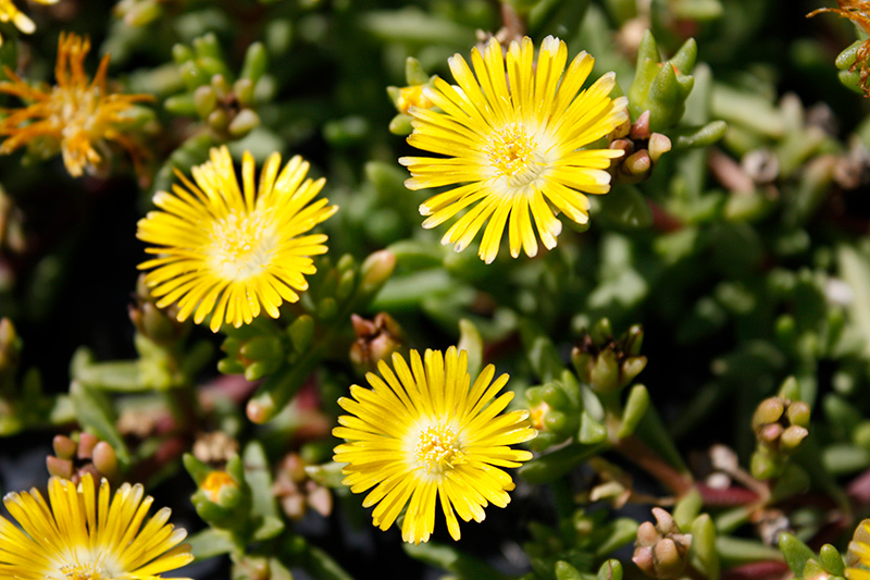 Delmara™ Yellow Ice Plant features showy yellow daisy flowers with white eyes rising above the foliage from late spring to late summer. Its attractive small succulent narrow leaves are bluish-green in color. As an added bonus, the foliage turns a gorgeous burgundy in the fall.