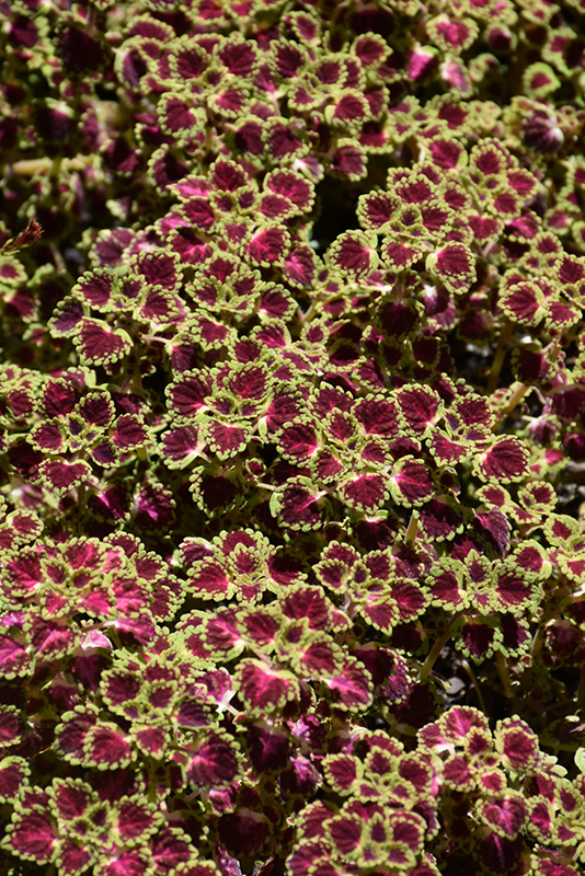 Great Falls® Iguazu Coleus' attractive serrated pointy leaves remain burgundy in color with distinctive lime green edges and tinges of rose throughout the year on a plant with a trailing habit of growth.