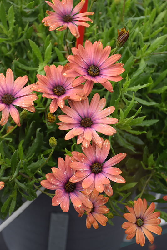 Bright Lights™ Horizon™ Sunset African Daisy is clothed in stunning salmon daisy flowers with peach overtones, black eyes and lavender centers at the ends of the stems from late spring to mid fall. The flowers are excellent for cutting. Its spiny narrow leaves remain green in color throughout the season.