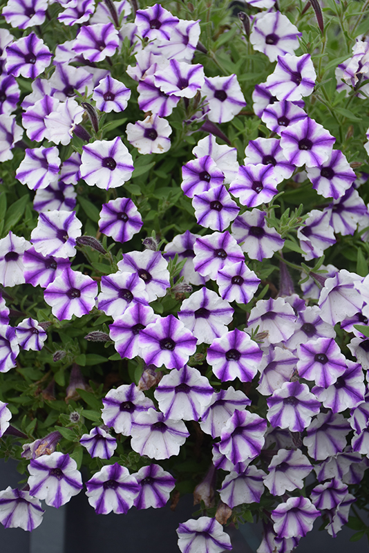 Supertunia Mini Vista® Violet Star Petunia is covered in stunning white trumpet-shaped flowers with violet stripes at the ends of the stems from mid spring to mid fall. Its pointy leaves remain green in color throughout the season.