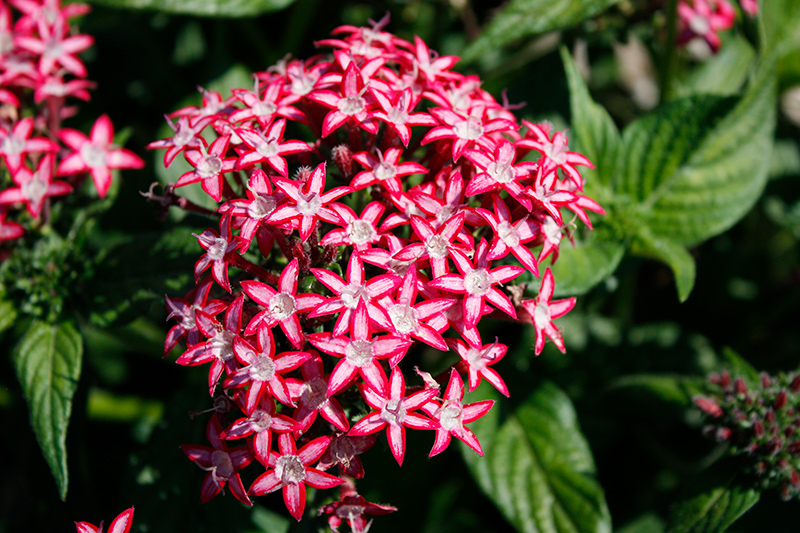 Glitterati™ Red Star Star Flower features showy clusters of red star-shaped flowers with white centers at the ends of the stems from late spring to early fall. The flowers are excellent for cutting. Its textured pointy leaves remain forest green in color throughout the season.