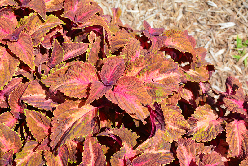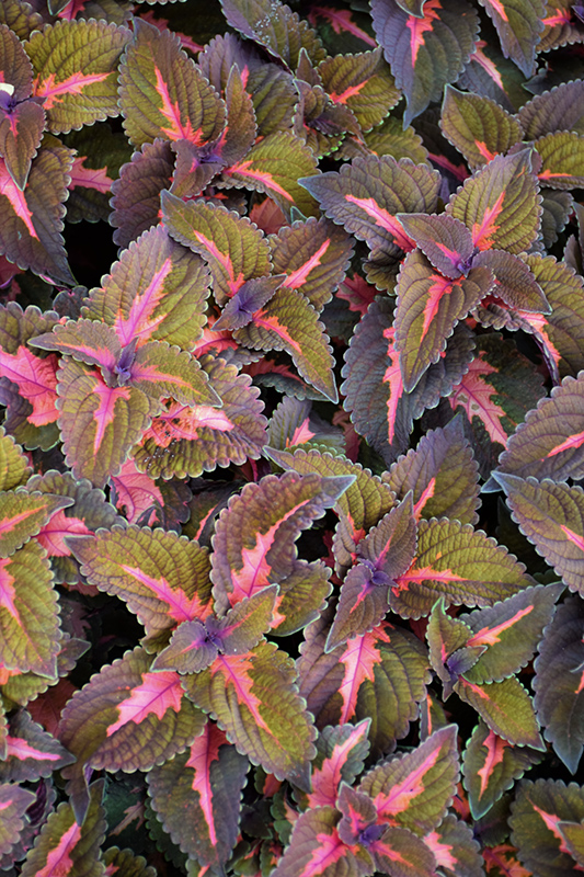 Main Street Sunset Boulevard™ Coleus' attractive serrated pointy leaves emerge olive green in spring, turning brown in color with showy rose variegation and tinges of coppery-bronze throughout the season on a plant with an upright spreading habit of growth.
