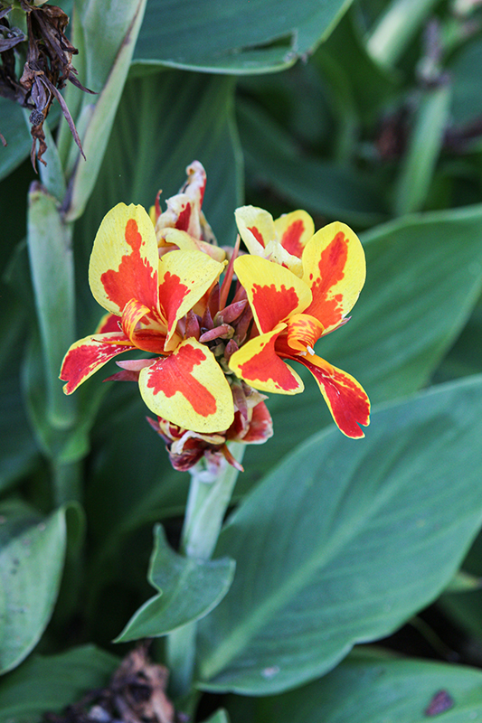 Cannova® Red Golden Flame Canna is a fine choice for the garden, but it is also a good selection for planting in outdoor pots and containers. With its upright habit of growth, it is best suited for use as a 'thriller' in the 'spiller-thriller-filler' container combination; plant it near the center of the pot, surrounded by smaller plants and those that spill over the edges. It is even sizeable enough that it can be grown alone in a suitable container. Note that when growing plants in outdoor containers and baskets, they may require more frequent waterings than they would in the yard or garden. Be aware that in our climate, most plants cannot be expected to survive the winter if left in containers outdoors, and this plant is no exception. Contact our experts for more information on how to protect it over the winter months.