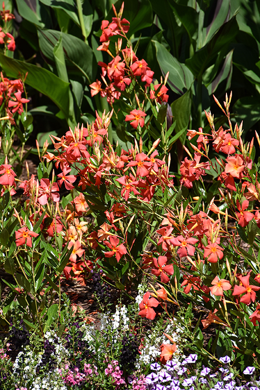 Sun Parasol® Fired Up Orange Mandevilla is a multi-stemmed evergreen tropical plant with a ground-hugging habit of growth. Its medium texture blends into the garden, but can always be balanced by a couple of finer or coarser plants for an effective composition.