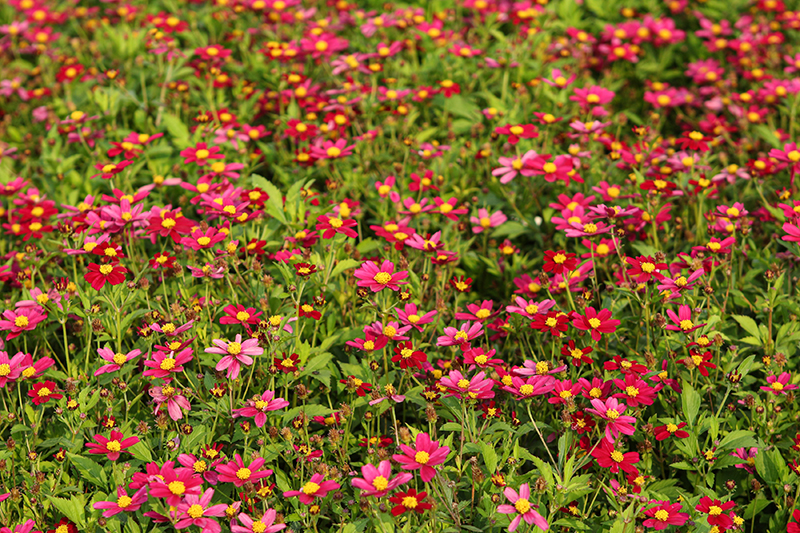 Bee Pink Buzz Bidens has masses of beautiful pink daisy flowers with fuchsia overtones and gold eyes at the ends of the stems from late spring to mid fall, which are most effective when planted in groupings. Its small ferny leaves remain green in color throughout the season.