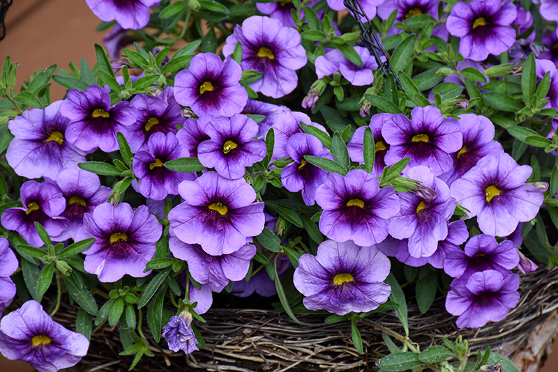 Aloha Kona Hula Blue Sky Calibrachoa is clothed in stunning lavender trumpet-shaped flowers with yellow throats and deep purple centers at the ends of the stems from late spring to early fall. Its small pointy leaves remain green in color throughout the season.
