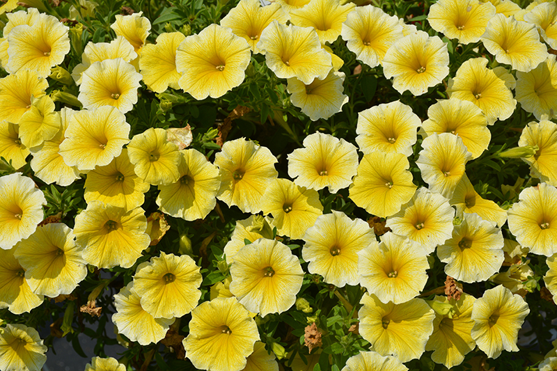 Supertunia® Saffron Finch™ Petunia is clothed in stunning yellow trumpet-shaped flowers with gold throats and creamy white edges at the ends of the stems from mid spring to mid fall. Its pointy leaves remain green in color throughout the season.