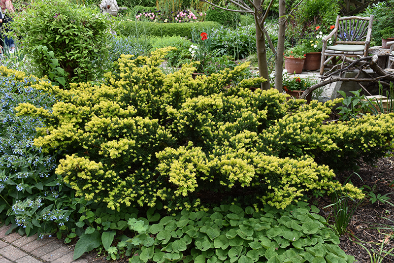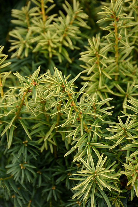 A brilliantly colored yew whose individual needles have a rich gold band around the edges, from a distance the effect is a glowing yellow, eventually becomes a large spreading shrub; makes a fine foundation garden plant, best with some shade