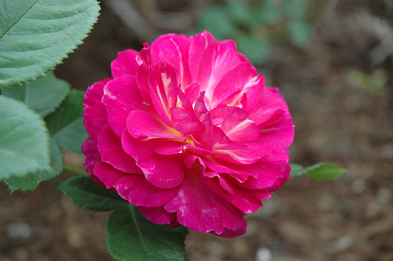 Outta The Blue Rose features showy fragrant double fuchsia flowers with plum purple overtones and white centers at the ends of the branches from late spring to mid fall. The flowers are excellent for cutting. It has dark green deciduous foliage. The glossy oval compound leaves do not develop any appreciable fall color. The fruits are showy red hips displayed in late fall.